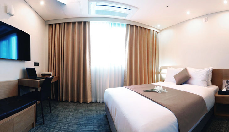 落ち着いた雰囲気のモダンなインテリア、シモンズ社のビューティレスト・プレミアム(Simmons Beautyrest Premium)ベッド、熟眠のための寝具とカーテン、いつでもどこでもご利用いただける無料有無線インターネット(Wi-Fi)、多様なチャンネルの衛星放送、テレビとデバイスを直接接続するUSBアウトレットを備えた客室です。